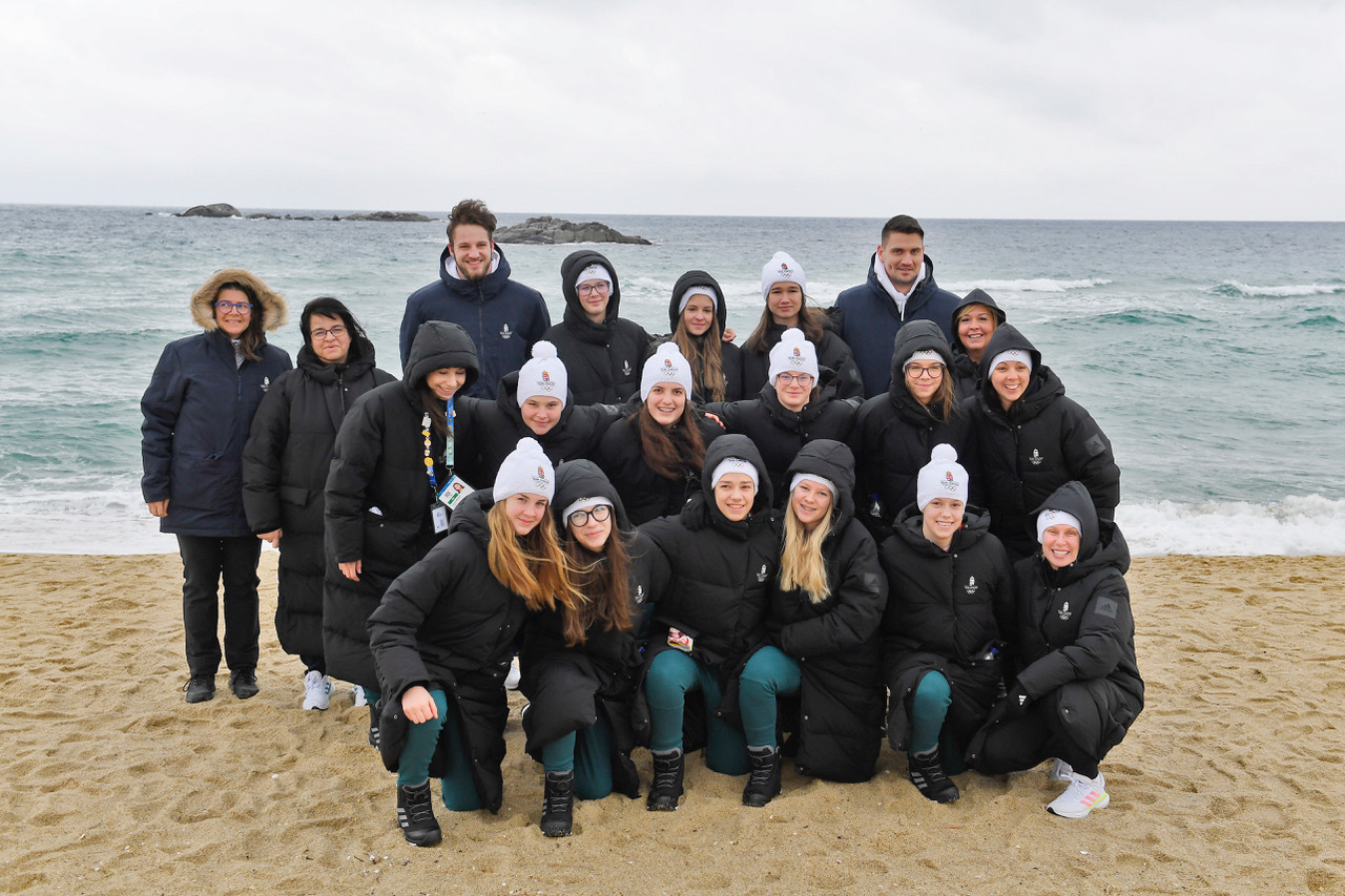 A tengerparton sétáló gangwoni önkéntesek összeszaladtak, amikor a magyar jégkorongos lányok a reggeli átmozgató séta közben összeálltak egy csatakiáltásra, rögtön be is kerültek néhány koreai család fotóalbumába.